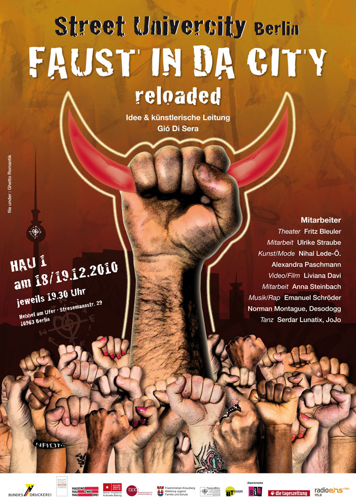 FAUST ist nicht nur einer der bekanntesten Theaterstoffe Deutschlands sondern auch ein Symbol des Aufbegehrens. Die Jugendlichen der StreetUniverCity Berlin e.V. in Kreuzberg erhalten eine Stimme auf der Bühne und thematisieren ihre Stellung in der Gesellschaft. Frei nach Goethe präsentieren sie das neu bearbeitete, multimediale Stück „Faust in da City” mit den Mitteln des Schauspiels, des Gesangs, des Tanzes und des Films auf der Bühne des HAU 1. In der neuen Bearbeitung wird Faust von Mephisto in Auerbachs Keller gelockt, um die Leichtigkeit des Seins zu erfahren. Ob Faust damit wohl geködert werden kann?